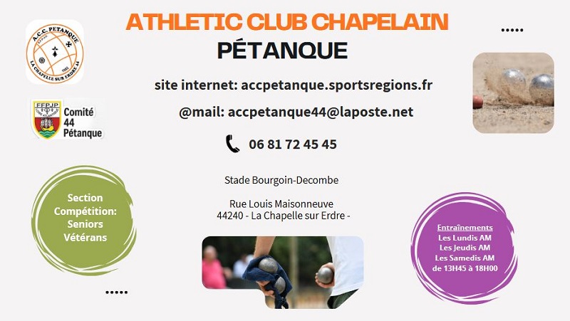 L'Acc Pétanque était représenté par 3 triplettes 60 ans et plus au championnat départemental du 21 avril à St Nazaire (140 triplettes présentes au départ) dont celle composée par Bernard Bidon ,Laurent Melle et Pascal Chaignon qui a obtenu sa qualification pour le Championnat Régional de Pétanque des Pays de Loire en perdant en 1/4 de final (pour la deuxième année consécutive mais en 2021 le Championnat Régional avait été annulé en raison du Covid)